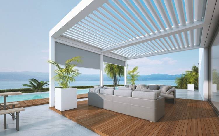 Die Pergola kann mit seitlichen Sonnenblenden oder Glaswänden und LED-Beleuchtung ausgestattet werden.