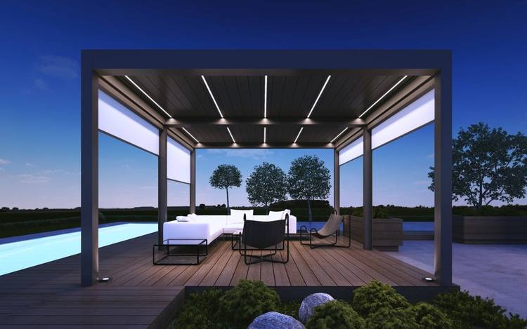 Die durchdachte Konstruktion ermöglicht den Einsatz von seitlichen Blenden, wie beispielsweise dem SkyRoll-Sonnenschutzsystem oder Glasschiebewänden. Das schafft wetterunabhängig eine einzigartige Atmosphäre in der Natur. Zusätzlich kann eine LED-Beleuchtung, die die Dachlamellen nicht beeinträchtigt, angebracht werden. Diese wird in Form eines LED-Streifens und eines Strahlers im Dach der Pergola sowie einer zusätzlichen Randbeleuchtung installiert.