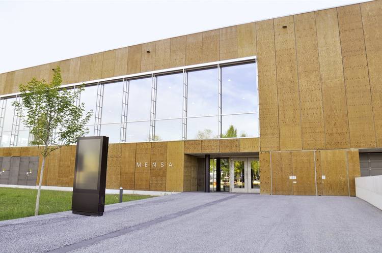 Mensa Garching mit Holz-Glas-Fassade und Verbinder von Knapp