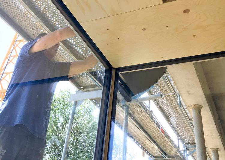 Im Anschluss wurde die Konstruktion mittels Sperrbügel gesichert, um Verschiebungen zu verhindern. Danach stellten die Monteure die Fugenabstände mit den Verbindern ein, um die Bautoleranzen auszugleichen. Dabei wurden die Riegel dicht an die Pfosten gezogen.