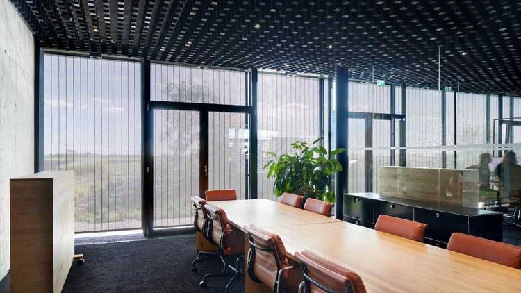 Wesentlichen Anteil an Lichtführung und thermischem Komfort hat der außenliegende Metallbehang s_enro von MHZ, einer der führenden Hersteller für Sicht-, Sonnen- und Insektenschutz aus Leinfelden-Echterdingen. Als bewegliches Sonnenschutzsystem konzipiert, prägt der Behang als gestalterisches Element die architektonische Identität des Gebäudes. Er gewährleistet einen zuverlässigen Sonnenschutz – selbst bei Windgeschwindigkeiten bis zu 18 m/s – und ermöglicht dennoch eine visuelle Offenheit nach außen. Besonders dann, wenn Sonne und starker Wind – wie es in der küstennahen Region öfter mal der Fall ist – gemeinsam auftreten, spielt das System von MHZ seine Stärken voll aus.
