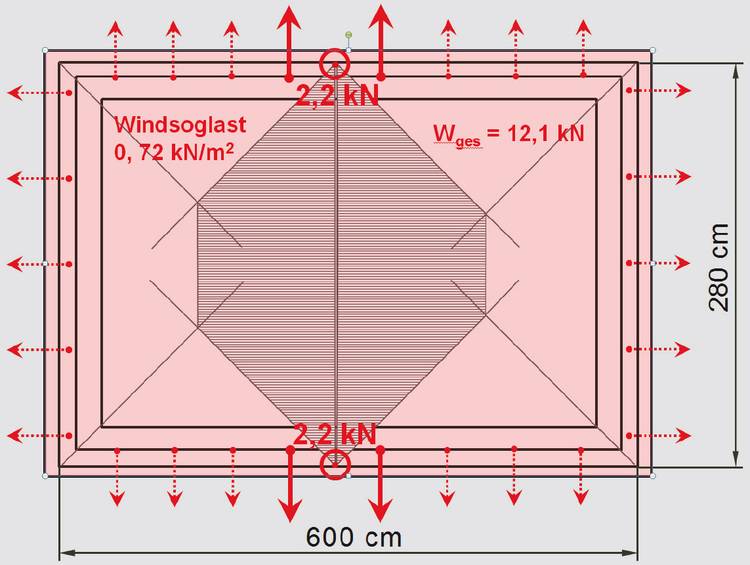 Bei großflächigen Fenstern kommt es an den Enden von Kopplungen, Pfosten und Riegeln zur Einleitung von Punktlasten, die bei der statischen Auslegung der Befestigungspunkte zwingend zu berücksichtigen sind. Die gleichmäßige Aufteilung der Windlasten auf alle Befestigungspunkte – bei umlaufend befestigten Fenstern ohne Unterteilung üblich – würde zu einer wesentlich zu niedrigen Lastaufteilung an den Befestigungspunkten an den Enden des Mittelpfostens führen. Das Beispiel in Bild 3 zeigt dies anhand der Ermittlung der Windsoglast.