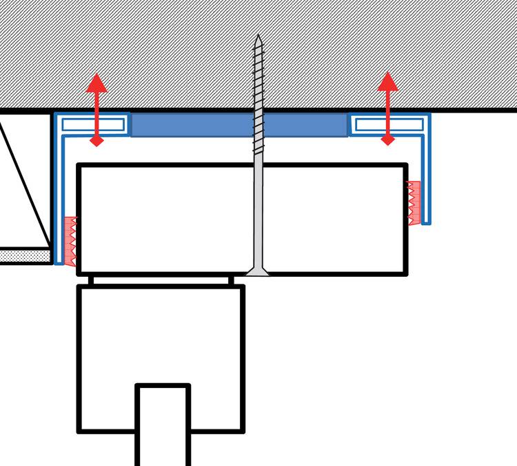 Weiter dürfen bei der Lastabtragung von großflächigen Fensterelementen keine Lasten aus dem Baukörper auf das Fenster übertragen werden. Besonders bei größeren Spannweiten (ab ca. 2 m Elementbreite) darf eine eventuelle Sturzabsenkung weder auf das Element einwirken noch zu einer irreversiblen Lageänderung der horizontalen Rahmenprofile führen. Falls eine Absenkung des Deckenbereichs über den großflächigen Elementen zu erwarten ist, muss die Montage nur als Horizontallasten übertragendes „1-wertiges“ Lager ausgeführt werden. Hier lässt sich z.B. das Prinzip einer „Bausenkzarge“ umsetzen, bei dem das obere Rahmenprofil in einem zusätzlichen Profil geführt wird (siehe Bild 4).