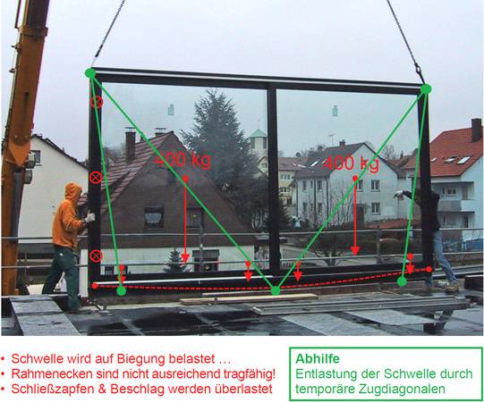 Zur Findung der Schadensursache wurde eine Bauteilöffnung des Wärmedämmverbundsystems vorgenommen. Die Lastabtragung erfolgte über massive Stahlwinkel, die an der Stirnseite der Stahlbetondecken befestigt waren. Bei Vermessung der Auflagerwinkel zeigte sich, dass sich diese mit den Stahlbetonbauteilen gesetzt hatten und somit für die Absenkung im Boden- und Deckenbereich verantwortlich waren. Auf diese Schadensursache wird im Schadensfal 2 näher eingegangen. Weiterhin übergab der Bauherr eine Fotodokumentation der Montage, unter anderem auch mehrere Fotos vom Krantransport (Bild 6). Die Elemente wurden mit verglasten Flügeln an den seitlichen Enden des oberen Rahmenprofils am Kran angeschlagen. Aufgrund der hohen Flügelgewichte von jeweils ca. 400 kg wurden die Beschläge und Rahmeneckverbindungen überlastet.