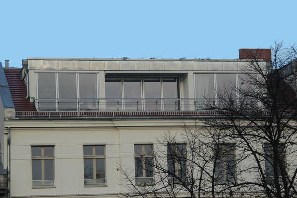 In einem weiteren Schadensfall wurden Bedienungsstörungen an sechs Faltanlagen angezeigt. Die Faltanlagen waren im Zuge einer Dachaufstockung in Dachgauben montiert worden und seit ca. einem halben Jahr in Nutzung (Bild 8). Beim Ortstermin wurde festgestellt, dass an sämtlichen Faltanlagen ein direkter Kontakt zwischen den waagerechten Blendrahmen- und den Flügelprofilen vorlag. Die Kontrolle der waagerechten Profile ergab, dass sowohl eine mittige Absenkung des Sturzes als auch die seitliche Absenkung der Schwelle („Kissenform“) hierfür verantwortlich waren. Die nach der Fenstermontage aufgebrachte Dachbegrünung mit hohem Eigengewicht hatte zu dieser Lageänderung der Dach- und Deckenkonstruktion geführt.