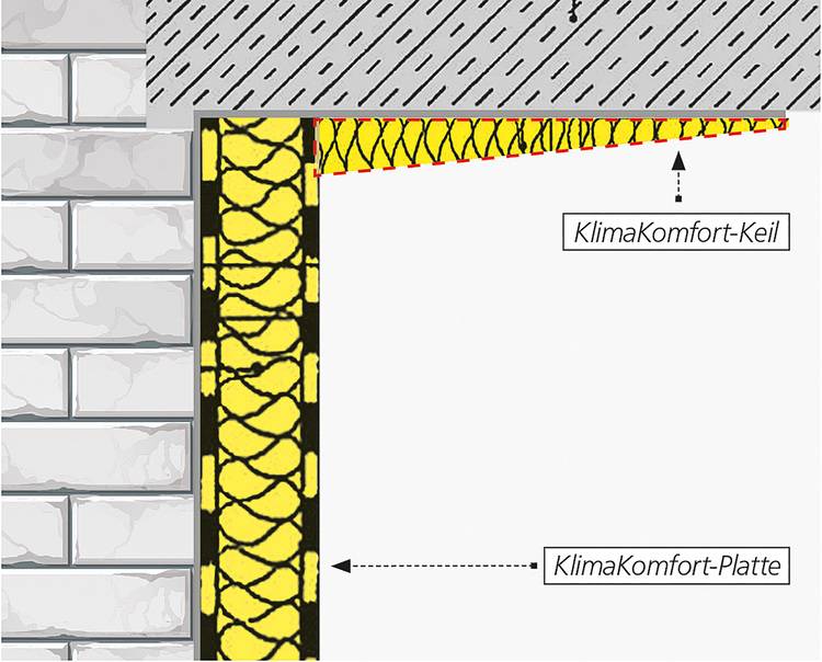 Als eine Schwachstelle bei der Schimmelsanierung erweisen sich häufig Übergänge zu Decken und Ecken: Konstruktiv liegen hier zwangsläufig Kältebrücken vor. Um diese Kältebrücken nach innen zu vermeiden, müssten angrenzende Bauteile ebenfalls angepasst werden – eine schon optisch unerwünschte Lösung. Der „KlimaKomfort Keil“ bietet eine praktische und professionelle Alternative: Die keilförmige Platte hat an einer Seite eine Dicke von 25 Millimetern und läuft auf 5 Millimeter aus. So entsteht optisch der Eindruck eines ansatzlosen Übergangs. Zugleich wirkt dies dem „Kühlrippen-Effekt“ von Innenwänden und Decken entgegen, der bei Innendämmung droht, wenn sich die Dämmung auf die Innenseite der Außenwand beschränkt.