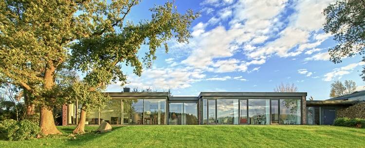 Ob eine Glasfassade für das Einfamilienhaus oder ein Bungalow mit Glasfront: Panorama Glasfassaden sehen modern und elegant aus und bringen die Natur quasi direkt ins Wohnzimmer. Doch große Flächen aus Glas müssen klug geplant werden. Die optische Wirkung von übergroßen Panorama-Glasflächen kann durch die Ausführung breiterer Profile innerhalb der Fassade negativ beeinflusst werden. Aus diesem Grund haben die Architekten von gruppeomp nach einer Lösung recherchiert, die es ermöglichen sollte, sowohl Holz im Innenbereich, Alu im Außenbereich sowie eine extrem schlanke Form miteinander zu vereinen.