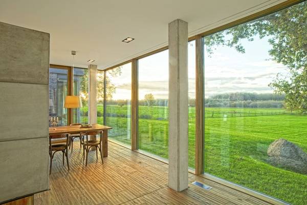Damit die optische Wirkung der Panorama-Fenster durch die breiten Profile nicht negativ beeinträchtigt werden, entschieden die Architekten sich für eine Lösung in Gestalt der systemischen Holz-Alu-Fassade FineLine von Unilux. Diese habe laut Architekten genau die gesuchten Möglichkeiten für die Fassade geboten und konnte auch aus Sicht des Interior-Designs sehr exakt mit den Eichendielen des Bodens abgeglichen werden. Peter Pumplün, zuständiger Architekt des Rasteder Büros von gruppeomp, beurteilt auch den systembedingten Workflow positiv: „Ich persönlich empfand die gesamte Produktion aller Fenster, Türen und der Pfosten-Riegel-Fassade aus einer Hand als sehr angenehm und im Sinne der Bauleitung als sinnvolle Erleichterung“. Eine Pfosten-Riegel-Fassade überzeugt zudem nicht nur wegen ihrer Optik, sondern auch wegen ihrem bauphysikalischen Verhalten.