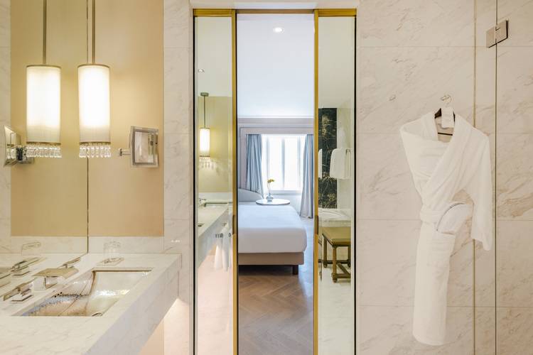 Zimmer und Suiten bieten dem Gast einen majestätischen Empfang. Materialien wie Marmor, antike Bronze und dunkles Walnussholz verströmen ein Ambiente von Opulenz und Luxus. Reich geschmückt mit Ornamenten und Details ist das Interieur wahrhaft imposant. Gelungene Gegensätze sorgen dafür, dass das Gesamtbild begeistert: Helle Wandflächen kontrastieren mit der warmen Farbe des Parkettbodens, kühle, edel glänzende Marmorwände mit samtweichen Teppichen.