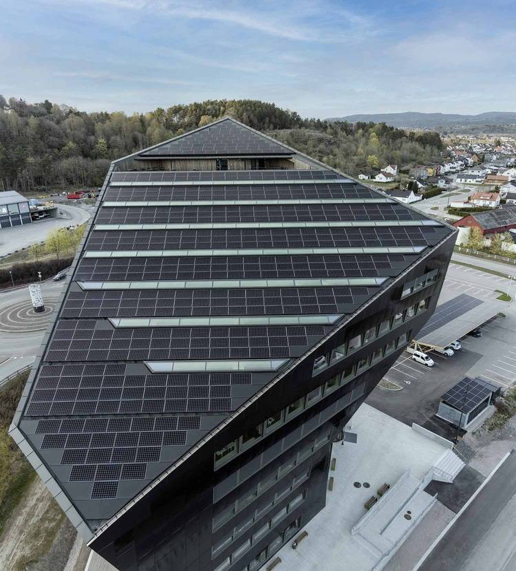 Die (i)konische Gebäudeform macht nicht nur optisch eine gute Figur. Auch unter energetischen Gesichtspunkten ist sie vorteilhaft: Um ein Maximum an Sonnenstrahlen einzufangen, wurde die Dachfläche imposant um 24 Grad gen Süden geneigt und mit hocheffizienten integrierten Photovoltaik-Modulen der dänischen Firma SolarLab mit einem Wirkungsgrad von 22 Prozent und einer Leistung von 210 Kilowatt Peak bestückt.