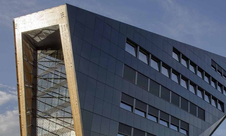Auch bei der Materialauswahl hatten Umweltverträglichkeit und Langlebigkeit oberste Priorität, um möglichst viel CO2 zu sparen. Das Schüco Fassadensystem FWS aus Aluminium überzeugte hier nicht nur durch das Cradle-to-Cradle-Zertifikat in Silber, sondern auch durch eine hundertprozentige Recyclingfähigkeit ohne Qualitätsverlust. Daneben waren weitere vorteilhafte Eigenschaften des Werkstoffes ausschlaggebend für die Wahl des Fassadensystems, beispielsweise seine Leichtigkeit bei gleichzeitig sehr hoher Stabilität, seine hohe Korrosionsbeständigkeit durch Eloxierung und seine Unempfindlichkeit gegenüber Temperaturschwankungen.