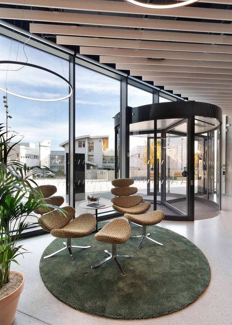 Im neunten Stock verbindet eine markante Holztreppe die Kantine mit den Tagungsräumen und führt hinaus auf die Dachterrasse, von wo aus sich ein herrlicher Blick auf den Fjord bietet. Standardisierte Innenraumlösungen und Co-Working-Spaces bieten den Mietern die Möglichkeit, ihre Büroräume nach Bedarf zu skalieren, um flexibel zu sein und Remote-Working-Konzepte umzusetzen.