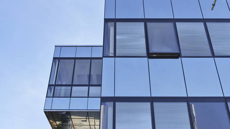 Die gestaltprägende Fassade ist als Ganzglasfassade im Structural-Glazing-Prinzip ausgeführt. Bei den hochglanzverspiegelten Fassadenpaneelen im Brüstungs- und Sturzbereich kam das Spiegelglas Mirastar von Saint-Gobain Glass zum Einsatz, das sich dank seiner widerstandsfähigen Chrombeschichtung für die Sicherheitsanforderungen an der Außenfassade eignet.