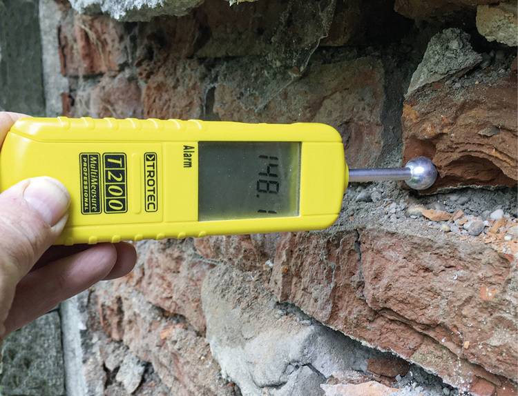 Mittels kapazitiv (elektrisches Feld) arbeitender Feuchtemessgeräte (Abb. 3) kann zerstörungsfrei, schnell und einfach abgeschätzt werden, ob ein solcher Schadensfall vorliegt. Bei einem kapillar leitfähigen Putzmörtel werden sich die oberflächennah gemessenen Feuchtewerte in etwa dem sichtbaren Schadensbild anpassen. Wurde ein dichterer Putz verwendet, misst man auch deutlich oberhalb der sichtbar feuchten Stellen höhere Werte.