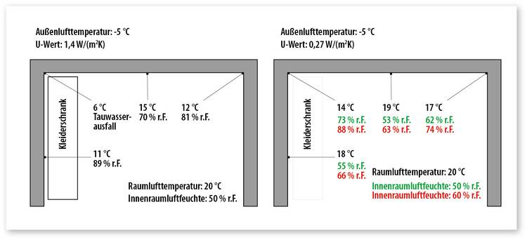 Dabei spielen auch Feinheiten, wie die Möblierung vor Außenwänden oder in Wandecken (Abb. 6), das „Beheizen“ von Räumen durch überströmende Warmluft aus anderen Zimmern (Abb. 7) und der generelle Feuchteeintrag in das Gebäude durch Kochen, Duschen oder die Anzahl und die Aktivitäten der Bewohner selbst eine Rolle.