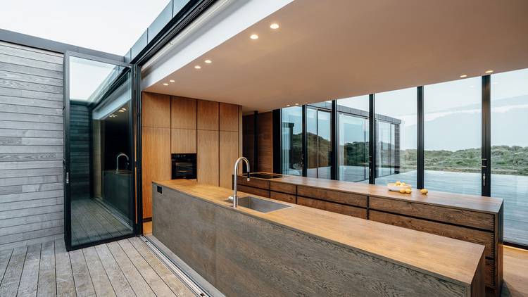 Eigentlicher Star des Strandhauses ist die Küche: Sie ist das räumliche Verbindungsglied zwischen dem Schlaf- und Wohnbereich und kann auf ihren beiden Längsseiten auf einer Breite von fast 6 m vollständig geöffnet werden. Verantwortlich für diese Metamorphose in eine trendige Outdoor-Küche sind Glas-Faltwände von Solarlux: Insgesamt sechs Elemente lassen sich auf jeder Seite mit dem Harmonika-Falt-Prinzip zusammenschieben und als schmales Glaspaket auf der Terrassenseite parken. Es entsteht eine Öffnungsbreite von 5,80 m, die Öffnungshöhe liegt bei 3,10 m.