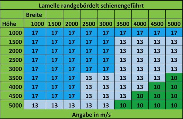 Beachtet werden muss auch, dass bei geringeren Materialstärken der Lamellen als 0,4 mm der Tabellenwert auf den nächstkleineren Wert abgemindert wird. Bei stark profilierten Lamellen wie z. B. Z- oder S-Form kann der Tabellenwert auf den nächstgrößeren Tabellenwert (max. 17 m/s) erhöht werden. Zusätzlich sind hier immer die Angaben der Hersteller zu beachten (z. B. zusätzliche Seilführungen und Wartungsintervalle).