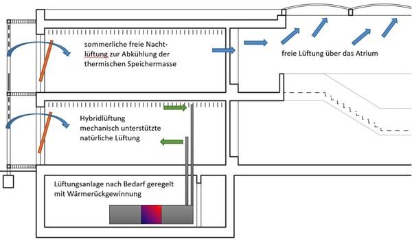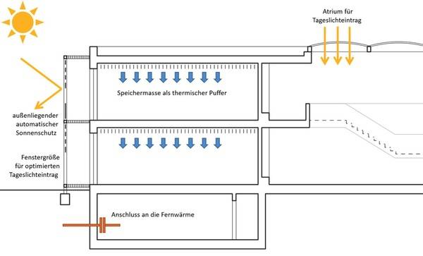 Für den Sonnenschutz tragen nach Ausführungen von Thomas Leiser sinnvolle passive und aktive Maßnahmen und eine optimierte Nutzung der natürlichen Ressourcen, wie beispielsweise der sommerlichen natürlichen Nachtauskühlung, wesentlich bei. Die haustechnischen Anlagen werden bei diesen Überlegungen auf das minimal notwendige Maß reduziert, ohne aber dabei das Ziel eines optimalen Raumkomforts und geringen Energie- und Ressourcenverbrauchs aus dem Auge zu verlieren.