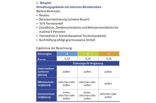 Hier werden viele Möglichkeiten genannt, wie Sonnenschutzvorrichtungen für ein Bürogebäude auszuwählen sind. Gemäß der Energieeinsparverordnung sind Berechnungen nach Norm DIN 4108-2 für den maximalen Gesamtenergiedurchlassgrad gtot max durchzuführen, damit dieser von der Verglasung einschließlich Sonnenschutz erreicht wird und somit ein ausreichender sommerlicher Wärmeschutz gewährleistet werden kann.