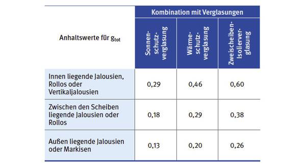 Interessanterweise gibt es hier auch Orientierungswerte zur Sonnenschutzwirkung von innen, zwischen und außen liegenden Sonnenschutzvorrichtungen in Kombination mit unterschiedlichen Verglasungen. Tabelle 2 zeigt beispielhaft, welche Einbaulagen geeignet sind, den berechneten maximalen Gesamtenergiedurchlassgrad gtot max zu unterschreiten.