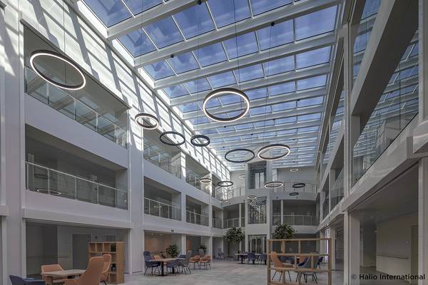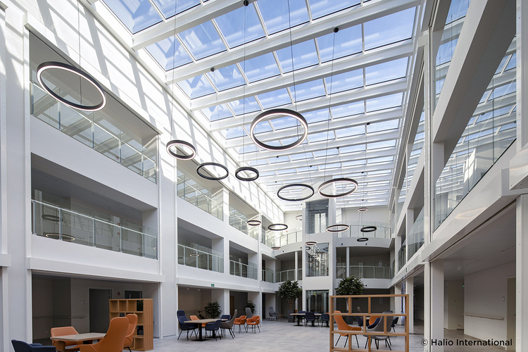 Mit Avondzon hat sich eine renommierte belgische Altenpflegeeinrichtung für dynamische Isolierglaseinheiten von Halio entschieden. Insgesamt 132 Fenster bilden ein Glasdach, das auf 304m2 Fläche den alten, im Jahr 1978 errichteten Trakt, mit dem im Jahr 2019 fertiggestellten Neubau verbindet. 73 moderne, großzügige Zimmer öffnen sich zu einem lichtdurchfluteten Gemeinschaftsbereich unter der Verglasung. Bei starker Sonneneinstrahlung können die Halio Glaseinheiten – separat oder in Gruppen – in weniger als drei Minuten komplett verdunkelt werden. Im getönten Zustand blocken sie 95% des Energieeintrags sowie 98% des Lichts. Tageslichteintrag und Sonnenschutz werden also miteinander optimiert.