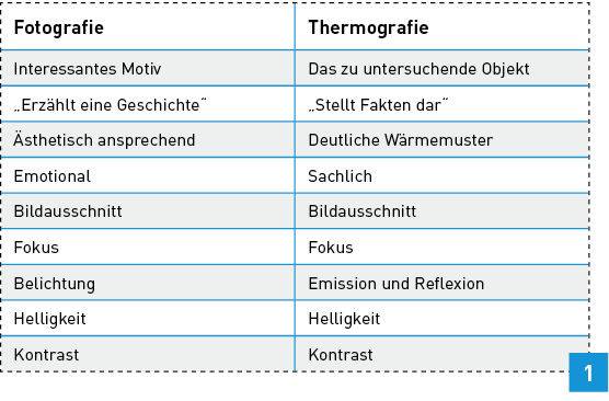 Auf einige Schlagwörter reduziert, lässt sich der Vergleich von Fotografie und Thermografie in einer Tabelle zusammenfassen (Bild 1). Wie in der Fotografie gibt es auch in der Thermografie zahlreiche Möglichkeiten, ein aufgenommenes Bild nachzubearbeiten, sofern es als radiometrisches Bild gespeichert wurde. Doch nicht alle Einstellungen sind veränderbar und somit sind auch nicht alle Aufnahmefehler reparabel.