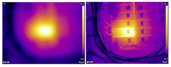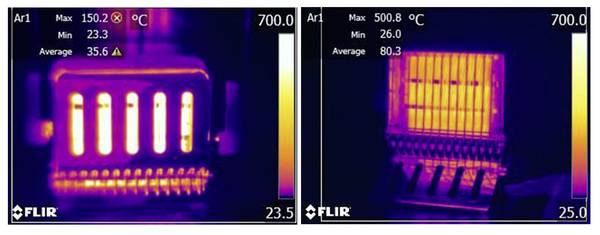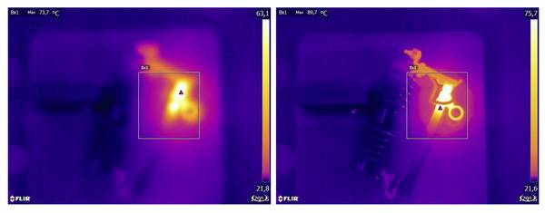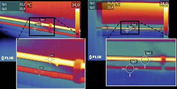 Für eine Aufnahme bzw. Temperaturmessung mit einer thermografischen Kamera sollte daher der niedrigstmögliche, in der Kamera verfügbare Temperaturmessbereich gewählt werden. Gleichzeitig muss dieser die höchsten Temperaturen im Bild abdecken (Bild 6). Je nach Kameramodell und Einstellungsmöglichkeiten können über- bzw. untersteuerte Bereiche im Wärmebild auch mit einer Kontrastfarbe angezeigt werden.