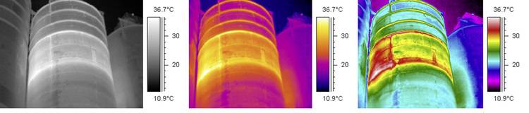 - Graupalette: Grautöne sind besonders geeignet, um kleine geometrische Details aufzulösen, aber weniger gut für die Anzeige kleiner Temperaturunterschiede.