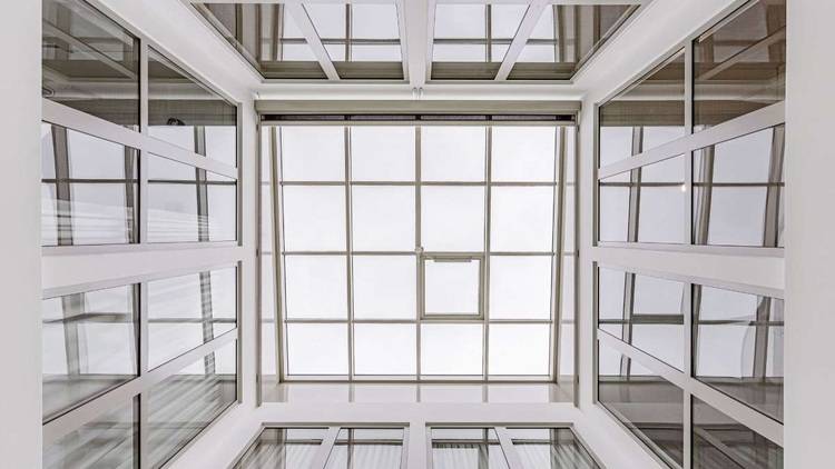 Das selbsttragende BA-Pfosten-Riegel-System aus Aluminium, das auf einer Stahlzarge montiert wurde, sorgt aufgrund besonders großer Drainagerinnen sowie gezielt gesetzten Entwässerungsschlitzen auf verschiedenen Ebenen für eine kontrollierte und zuverlässige Entwässerung, auch bei geringen Dachneigungen.