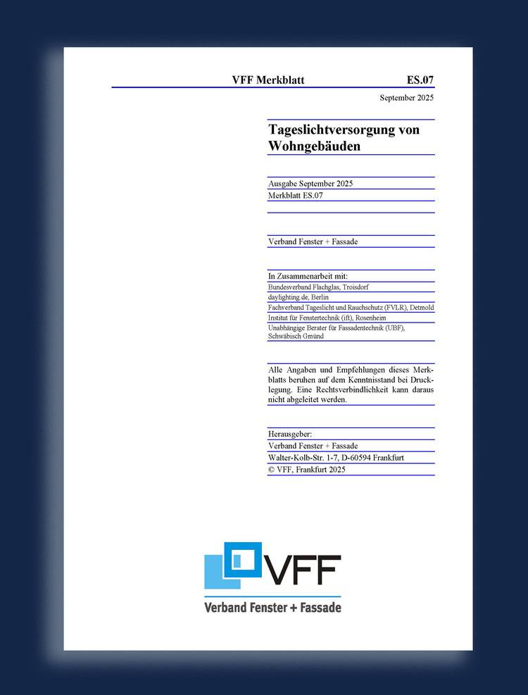 Das VFF-Merkblatt ES.07: 2025-09 Tageslichtversorgung von Wohngebäuden sowie weitere relevante Merkblätter können im VFF-Shop als Leseprobe eingesehen oder als PDF- bzw. Printversion erworben werden. Mitglieder des VFF erhalten ein Exemplar kostenlos. Für Sammelbestellungen ab 50 Stück ist ein Sonderpreis auf Anfrage unter vff@window.de erhältlich.