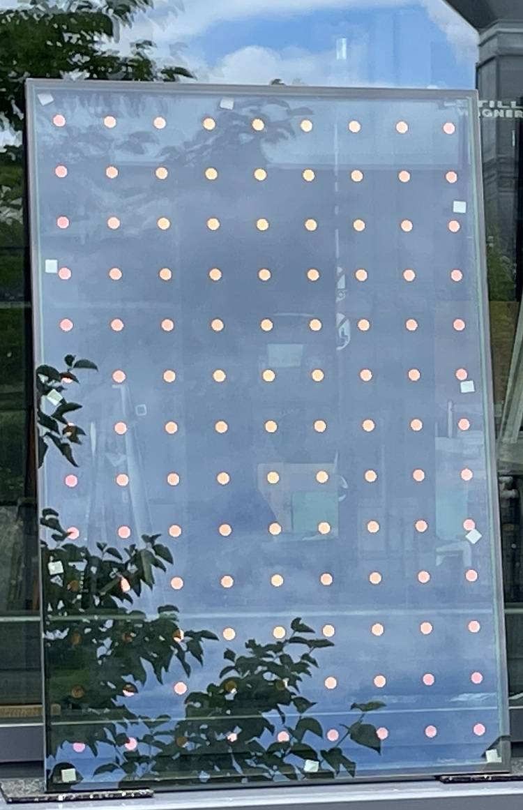 Mit einem Punktraster arbeiten auch die Forschenden des Fraunhofer Instituts für Solare Energiesysteme (ISE). Diese haben Vogelschutzglas entwickelt, das im Flugtunneltest nur vier Prozent der Vögel anflogen.