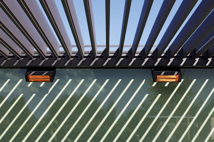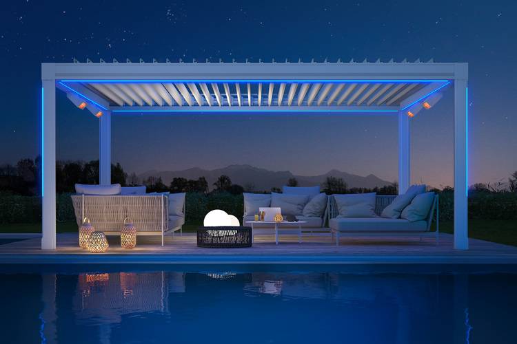Für variierendes Licht sind Pfosten und Attika mit farbigen LED-Bändern in 48 dimmbaren Farb- und drei Weißtönen ausgestattet, die Lamellen mit Weißlicht-LED-Bändern. Für angenehme Wärme sorgt das unter der Attika montierte Heizsystem Tempura. Wie alle elektrisch betriebenen Bauteile lassen sich auch LED-Bänder und Heizsystem per Funksteuerung mit nur einem Handsender bedienen.
