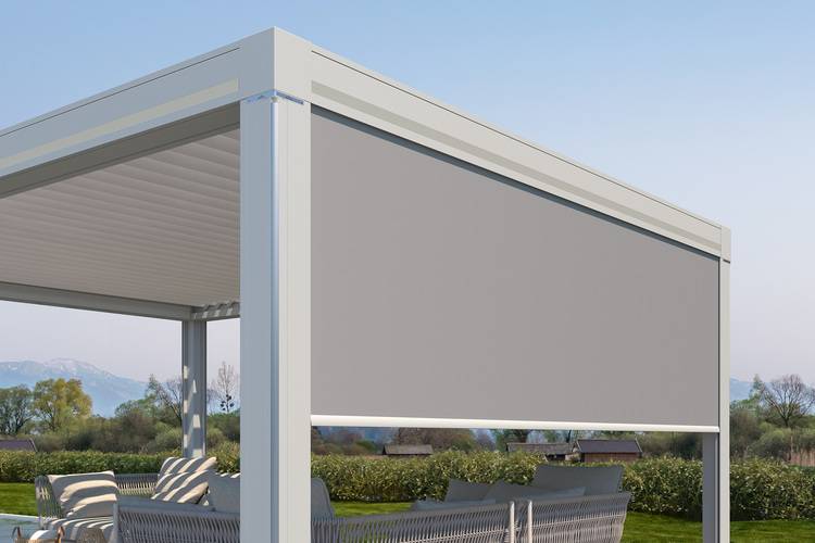 An allen Seiten des Lamellendaches lassen sich Vertikal-Beschattungen anbringen. Diese verschmelzen optisch mit der Rahmenkonstruktion und verschwinden in eingefahrenem Zustand komplett in der Attika. Sie sind auch zu einem späteren Zeitpunkt noch nachrüstbar. Bei Bedarf lässt sich Artares für noch mehr Wetterschutz auch mit Glas-Schiebewänden kombinieren.