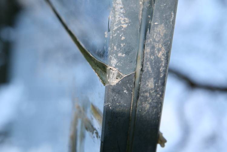 Beim ersten Ortstermins ließ der Sprungverlauf in die Glasfläche zunächst darauf schließen, dass es zu einem thermischen Glassprung gekommen ist, weil das im Bereich der oberen Glaskante gehegeseitig horizontal verlaufende Stahlrohr bei Sonnenschein einen Schlagschatten auf die Scheibe wirft.