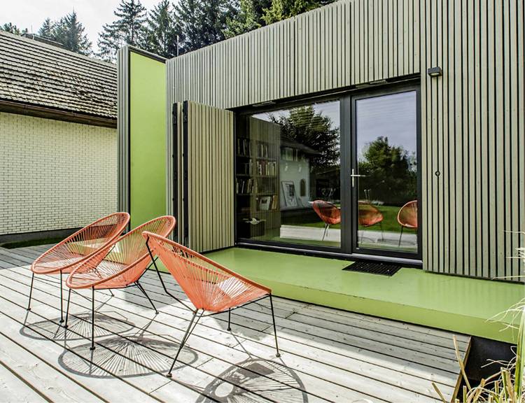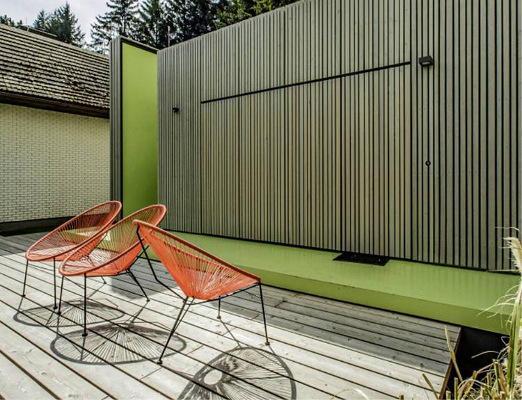 Trotz der getrennten Baukörper wirkt das Haus wie eine in sich geschlossene Einheit. Dafür sorgt die Fassade, die komplett mit kristallgrau lasiertem Lärchenholz verkleidet wurde. Holzlamellen in den drei Maßen 60 × 20 mm, 50 × 20 mm und 40 × 20 mm alternieren, sodass ein abwechslungsreicher Eindruck entsteht. Auch die flächenbündige Faltschiebeanlage von Baier fügt sich mit ihrer Rahmenfüllung aus Holz nahtlos in das Fassadenbild ein. Kleinste Fugen lassen die Faltschiebeanlage im geschlossenen Zustand mit der Fassade verschmelzen.