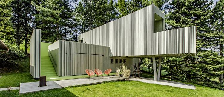 Zwei voneinander getrennte Baukörper mit Flachdach stapeln sich zueinander verdreht übereinander. Im unteren Hausteil befinden sich Hauswirtschafts- und Abstellraum mit einer vorgelagerten Holzterrasse, im oberen Abschnitt Wohnraum und Panoramaterrasse.