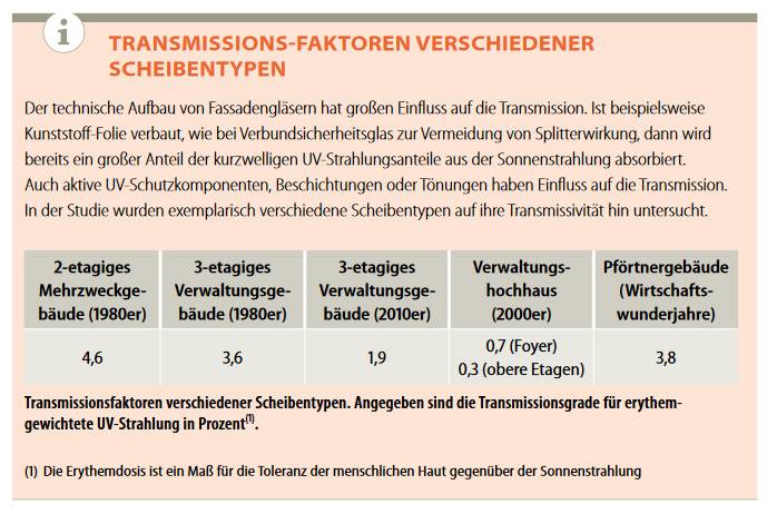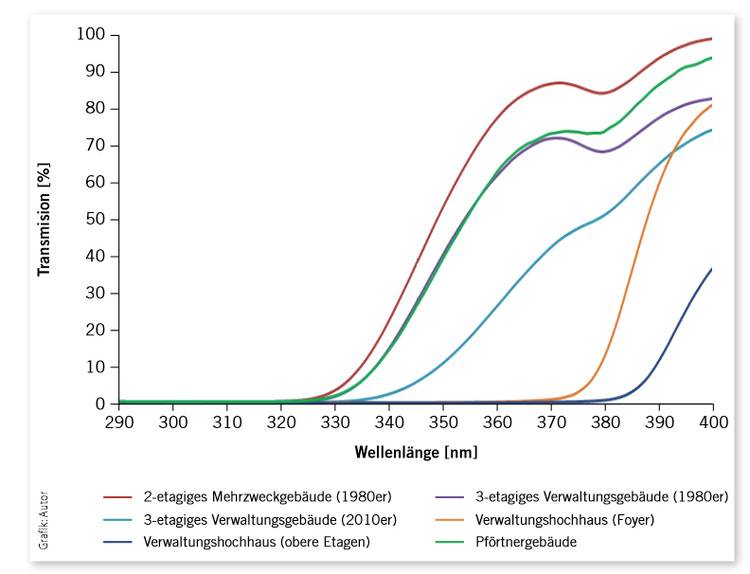 Insbesondere im untersuchten Verwaltungshochhaus existiert dadurch ein hoher UV-Schutz durch das Glas der Fassaden. Dort gelangt erst Strahlung mit Wellenlängen größer als 380 nm hindurch; ein Wellenlängenbereich, der in manchen Definitionen schon dem visuellen Blaulicht zugeordnet wird.