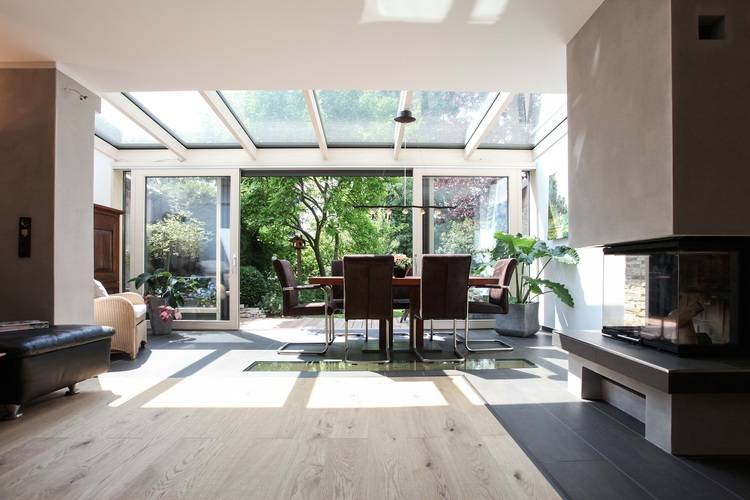 Meist wird versucht, den Boden des angrenzenden Wohnraums nahtlos in den Wintergarten zu führen, um so auch die Verbindung nahtlos zu machen.