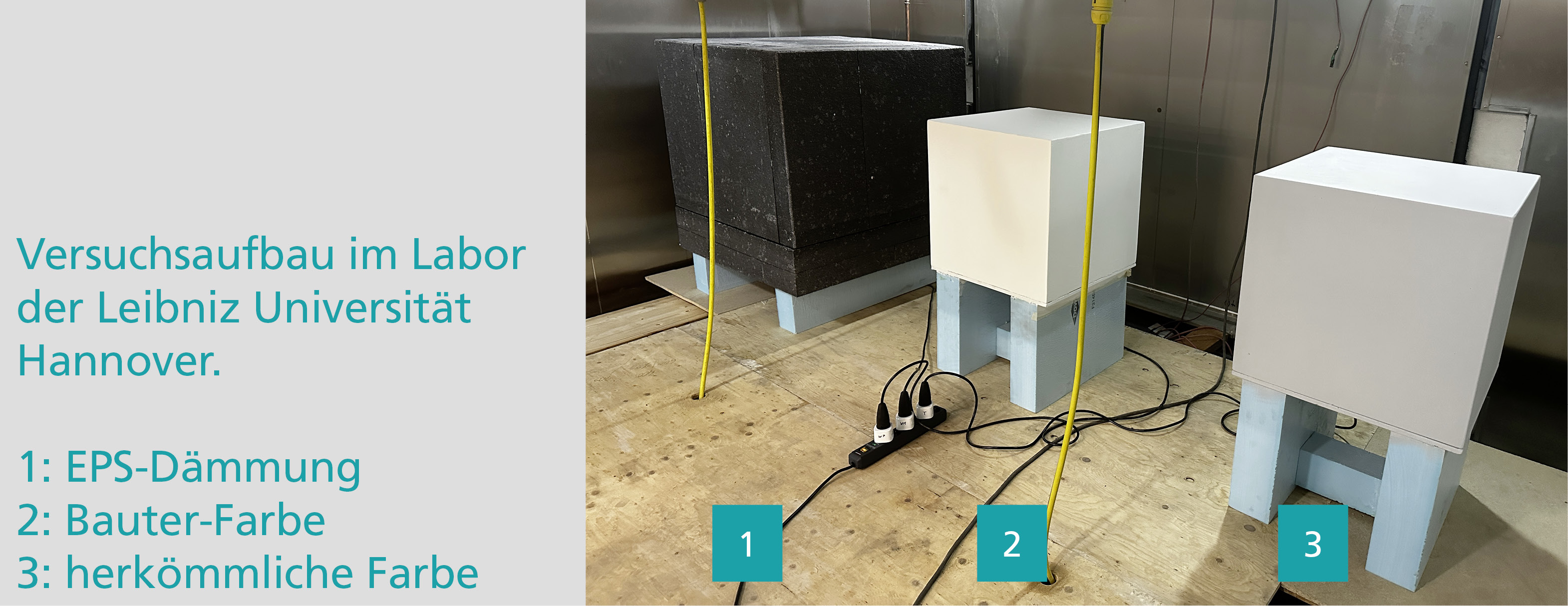 An der Universität Hannover wurden bei den Untersuchungen des thermischen Verhaltens der Bauter Nano-Dämmung drei identische würfelförmige Versuchskörper in einer Klimakammer unter gleichen Bedingungen getestet: