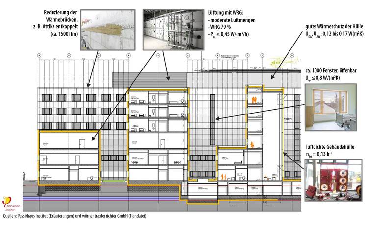 Insbesondere die Fenster, Lüftung und Leitungsdämmung entpuppten sich als äußerst komplex in Fragen zur Abstimmung untereinander. So waren für die Fenster beim Klinikum in Frankfurt Höchst zunächst energetisch sehr hochwertige Rahmen angedacht, deren Montage vollständig in der Dämmebene vorgesehen war, was in der Baupraxis Probleme aufwarf. Über einen langen Prozess in der Detaillierung und Komponentenauswahl sowie dank eines sehr detaillierten Leistungsverzeichnisses konnte letztendlich eine energetisch gleichwertige Lösung entwickelt werden (UW < 0,8 W/(m2K), die deutlich wirtschaftlicher zu realisieren war.