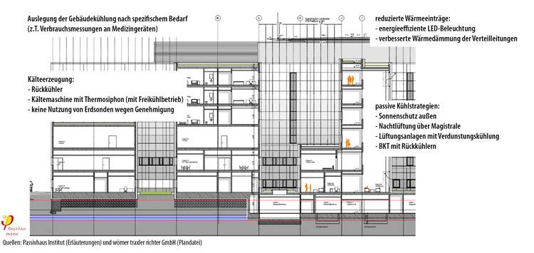 Um den Energiebedarf für die Kühlleistung zu reduzieren, griff man neben effizienten Geräten (Rückkühler, Kältemaschine) auch auf passive Kühlstrategien zurück (Abb. 6): So vermeidet ein außenliegender Sonnenschutz das Aufheizen der Räume über die 1.000 Fenster an dem Gebäudekomplex, und die zwischen den kammartig angelegten Gebäudeteilen durchführende Magistrale wird für die Nachtlüftung herangezogen. Daneben regulieren Lüftungsanlagen mit Verdunstungskühlung und die Betonkerntemperierung (BKT) mit Rückkühlern das Klima in den unzähligen Räumen. Die Reduktion der inneren Wärmelasten – zum Beispiel durch LED-Beleuchtung und angepasste Lichtkonzepte – leistet ihr Übriges.
