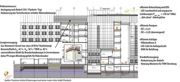 Die verschiedenen internen Wärmegewinne sind zu erfassen und es ist zu prüfen, wie sie sich optimal nutzen lassen. Stets geht es um den besten Kompromiss zwischen solaren Gewinnen, Tageslichtangebot, Wärmeverlusten und Überhitzungsrisiken. Und auch bei einem Krankenhaus steht man vor der Aufgabe, die passenden hocheffizienten technischen Anlagen für Lüftung, Heizung, Warmwasser und Kühlung zu planen und ihre Installation auf ein optimiertes Zusammenspiel hin auszurichten.