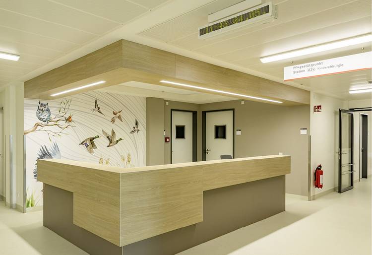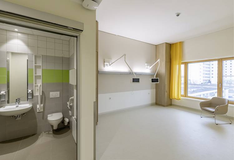 Jedes Patientenzimmer verfügt über eine eigene Nasszelle, was sowohl den Patienten entgegenkommt, aber auch den Pflegekräften die Arbeit und Versorgung erleichtert. In der neuen Klinik gibt es nur noch Zweibett-Zimmer, und diese sind so geräumig, dass das am Fenster stehende Bett ohne aufwändiges Rangieren aus dem Zimmer geschoben werden kann („Höchster Zimmer“). Auch an die Kleinsten wurde gedacht: Mit dem neu eingerichteten Kinderzentrum sind alle Stationen zentral auf einer Ebene untergebracht, kindgerecht gestaltet und eingerichtet: Kindernotaufnahme, Kinderklinik, Kinderchirurgie, Geburtshilfe mit Kreißsaal, Wochenstationen und Elternzentrum und natürlich Spielpunkte und -plätze (innen wie außen).