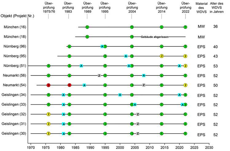 Die Ergebnisse aller untersuchten Objekte sowie die Angaben zur Errichtung, Inspizierung, eventueller Überarbeitung und Zustandsbewertung stellt Abb. 2 anhand von Zeitstrahlen dar. Dort sind auch die Kriterien für die Bewertungsgruppen angegeben. Das Alter der überprüften WDVS-Fassaden mit Mineralwolle- oder EPS-Dämmung liegt zwischen 36 und 53 Jahren. Mit einer Ausnahme wurden alle Objekte während ihrer Standzeit einmal oder mehrmals gestrichen.
