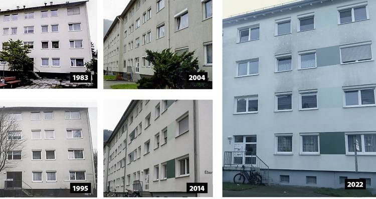 Dabei spielte ausschließlich der technische Zustand eine Rolle. Das heißt, Verfärbungen durch Verschmutzung oder mikrobiellen Bewuchs wurden zwar registriert, sind aber nicht Gegenstand der Klassifizierung. Abb. 1 zeigt beispielhaft den Gesamteindruck der Nordfassade eines Gebäudes im baden-württembergischen Geislingen, das bereits 1970 (Objekt 32 in Abb. 2) mit 30 Millimeter EPS gedämmt und 2006 mit 100 Millimeter EPS aufgedoppelt wurde, zu fünf verschiedenen Inspektionszeitpunkten von 1983 bis 2022.
