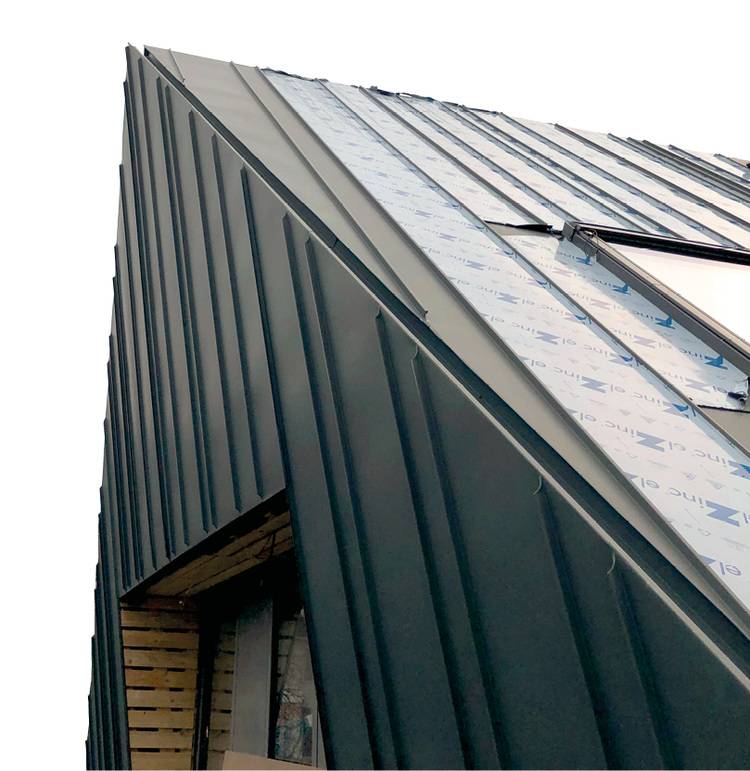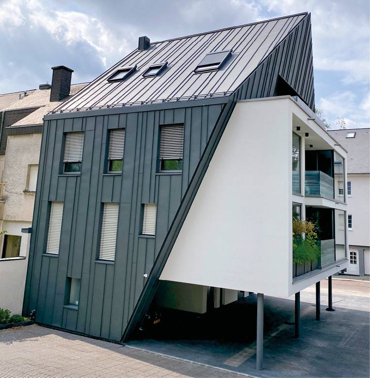 Der Architektenentwurf sah vor, dass die Falzverläufe der Dachfläche in die der Fassade übergehen. Dazu nutzte Michael Kirchen (Spenglermeister und Unternehmensgründer des Fachbetriebs Ferisol) vier verschiedene Schar-Deckbreiten. Im Ergebnis sorgen die durchgängigen Falzlinien für eine übergangslose Weiterführung der Deckelemente und bringen somit Dach und Fassade zusammen. Die bekleidete Gesamtfläche von 250 m² teilt sich auf in 170 m² Dachfläche und 180 m² Fassade.
