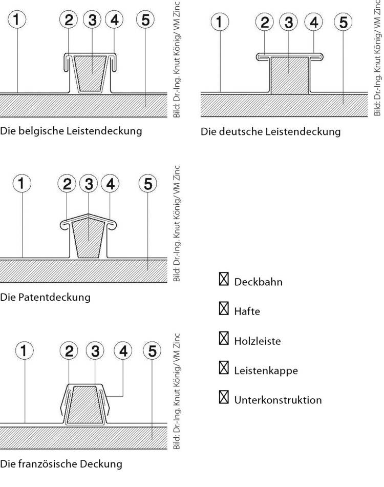 In Deutschland werden am häufigsten das belgische, das deutsche und das patentierte Leistensystem verwendet. Technisch gesehen gelten für diese Deckformen heute bezüglich Mindestgefälle, Scharlänge und -breite die gleichen Regeln wie beim Doppelstehfalzsystem.