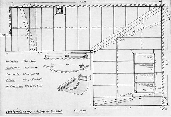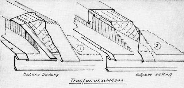 Durch die unterschiedlichen Bauweisen variieren die Traufanschlüsse. Da dieser Beitrag aufgrund der außerordentlich genauen Zeichnungen und der großen Detailtreue die Abbildungen aus der „Fachkunde der Bauklempnerei“ verwendet, werden die Anschlüsse für die belgische und die Patentleiste vorgestellt. Die Ausführung der Patentdeckung ist aufgrund des ähnlichen Aufbaus auch für die deutsche Deckung anwendbar.