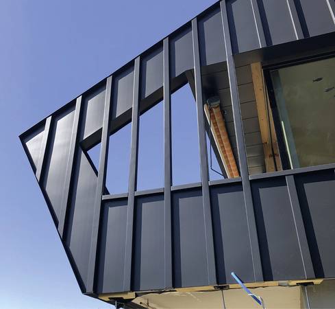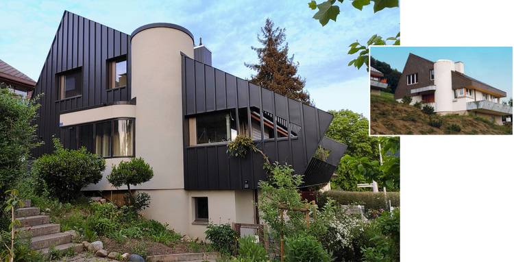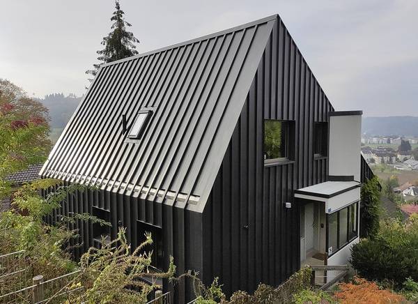 „Zunächst sollten die umfangreichen Sanierungsarbeiten an der Fassade in Eternit ausgeführt werden“, erinnert sich Roger Voney. Alternativ schlug der Fachmann vor, Fassade und Dach mit Metall zu bekleiden. Letztendlich fiel die Entscheidung auf 0,7 mm starkes Titanzink der Marke Rheinzink in der Oberfläche Artcolor Schwarzgrau. Eine weitere Herausforderung war mit der Erzeugung einer markanten Linienstruktur verbunden. Nach diversen Skizzen und entsprechenden Vorschlägen entschloss sich die Bauherrschaft für ein Leistensystem.