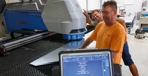 Entsprechende Spuren hat Valentin Schnyder auch bei den Fachbetrieben Blechnerei Gogolin e.K. und Blechnerei Johannes Schwär GmbH & Co. KG hinterlassen. Noch bedeutsamer ist, dass die Firmeninhaber Michael Lieb und Johannes Schwär inzwischen einen regen Austausch pflegen. „Das kollegiale Miteinander schätzen wir seit dem ersten Aufeinandertreffen anlässlich des BM-digital-Anwendernetzwerks im schweizerischen Elgg“, sagt Michael Lieb (Inhaber Blechnerei Gogolin, Singen). Eingeladen hatten damals BAUMETALL und Valentin Schnyder. Seither ist bei Gogolin viel geschehen. „Mit dem Vorantreiben der Digitalisierung und der Einführung von Bendex haben wir eine neue Langabkantmaschine von Jorns und eine Stanzmaschine von Euromac angeschafft“, sagt Lieb, der seinen Betrieb auch sonst zukunftsfähig aufgestellt hat. Jeder der zehn Mitarbeiter ist beispielsweise mit einem Tabletcomputer ausgestattet. Anstatt auf dem Aufmaßzettel erfolgt die Maßerfassung digital. Ebenso die Kommunikation mit Kollegen und Büro.